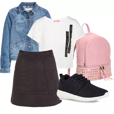 Σουέντ φούστα, 49 ευρώ, www.e-xclusive.comΓυναικείο σακίδιο Gessy – Kybeli, 42,00 ευρώ, favela.grTop, Pink Woman, 12.99 ευρώ, pinkwoman-fashion.comDenim Jacket, H&M, 34.99 ευρώ, www2.hm.comΑθλητικά παπούτσια, Bozikis, 19.99 ευρώ, www.bozikis.gr