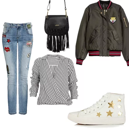 Τζιν με μπαλώματα Celestino, 29,95 ευρώ, celestino.grΚρουαζέ πουκάμισο e-xclusive, 49,00 ευρώ, e-xclusive.comBomber jacket με μπαλώματα H&M, 39,99 ευρώ, hm.com/grΤσάντα με κρόσσια Axel, 73,00 ευρώ, axelaccessories.comSneakers με αστέρια Bozikis, 19,99 ευρώ, bozikis.gr