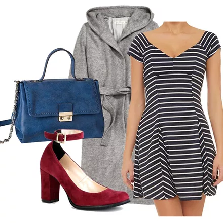 Φόρεμα με ρίγες, Pink Woman, 19.99 ευρώ, www.pinkwoman-fashion.comΓόβες με μπαρέτα, 50 ευρώ, www.e-xclusive.comΤσάντα, Achilleas Accessories, 19.95 ευρώ, achilleasaccessories.grΠαλτό, H&M, 79.99 ευρώ, www.hm.com/gr