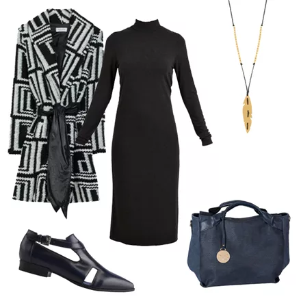 Ανθρακί μίντι φόρεμα, e-xclusive, από 39 ευρώ τώρα 23 ευρώ, www.e-xclusive.comΠαλτό με ασπρόμαυρο μοτίβο, BSB, από 119 ευρώ, τώρα 71,40 ευρώ, www.bsbfashion.comStefan Oxford Jeffrey Campbell, favela.gr, από 150 ευρώ τώρα 60 ευρώ, www.favela.grΤσάντα χειρός High Concept, Achilleas Accessories, από 61,90 ευρώ τώρα 30,95 ευρώ, www.achilleasaccessories.grGold Alpha Feather Necklace Annita Sima, aesthet.com, 60 ευρώ, aesthet.com