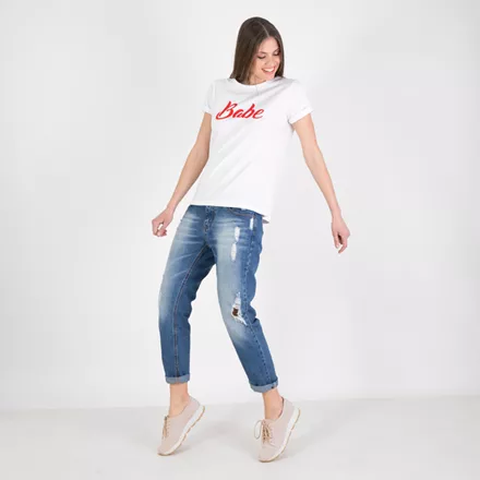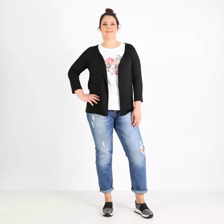 Τοπ με στάμπα, ζακέτα, τζιν και sneakers