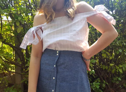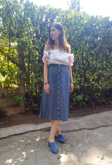 Η Νικολίνα διάλεξε ένα trendy all day look. Μια denim φούστα, ένα ριγέ έξωμο τοπ και στυλάτα mules που μπορούν να φορεθούν από το πρωί ως το βράδυ.