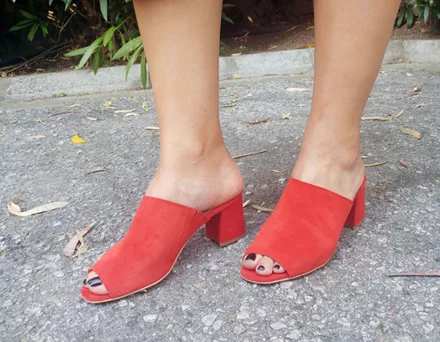 Τα κόκκινα mules με το άνετο τακούνι μπορούν να αναβαθμίσουν ακόμα και το πιο απλό look.
