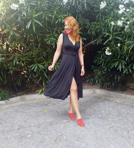 Η Βασίλικη επέλεξε το wrap dress: βασικό κομμάτι της γυναικείας γκαρνταρόμπας και κολακευτικό για κάθε σωματότυπο. Το συνδύασε με ένα ζευγάρι κόκκινα mules!