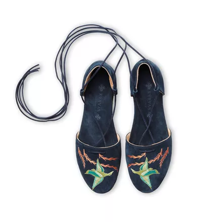 Σουέντ εσπαντρίγιες με κέντημα από τις τοιχογραφίες της Κνωσσού, Kyrvan, 210,00 ευρώ, kyrvanshoes.com