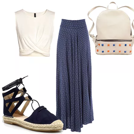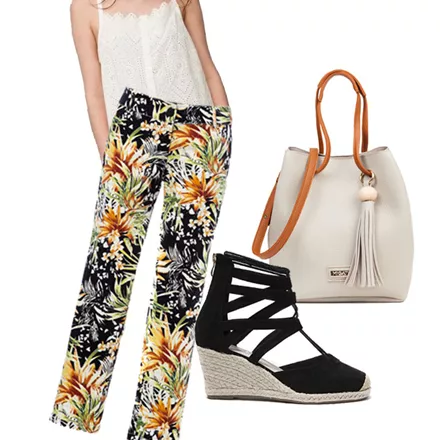 Εσπαντρίγιες, 49 ευρώ, www.keepfred.grΤοπ, Attrattivo, 34.90 ευρώ, www.attrattivo.grΤσάντα, 50 ευρώ, www.migato.comΠαντελόνι chino εμπριμέ, 58.90 ευρώ, www.helmi.gr