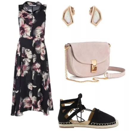 Φόρεμα midi αμάνικο, Helmi, 64,90 ευρώ, www.helmi.grΕσπαντρίγιες, Keep Fred, 35,00 ευρώ, www.keepfred.grΣκουλαρίκια, Li La Lo, 50,00 ευρώ, www.lilalo.comSuede τσάντα, H&M, 49,99 ευρώ, www.hm.com