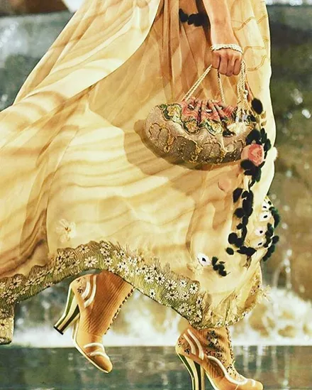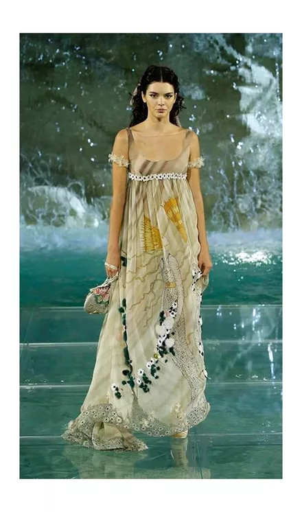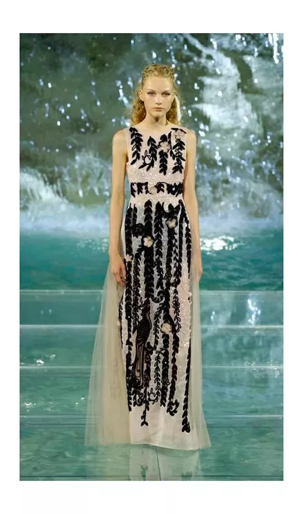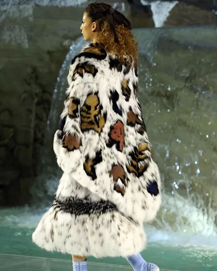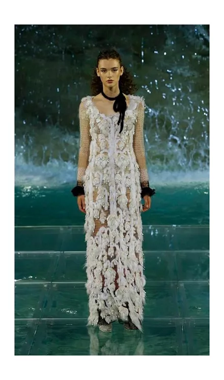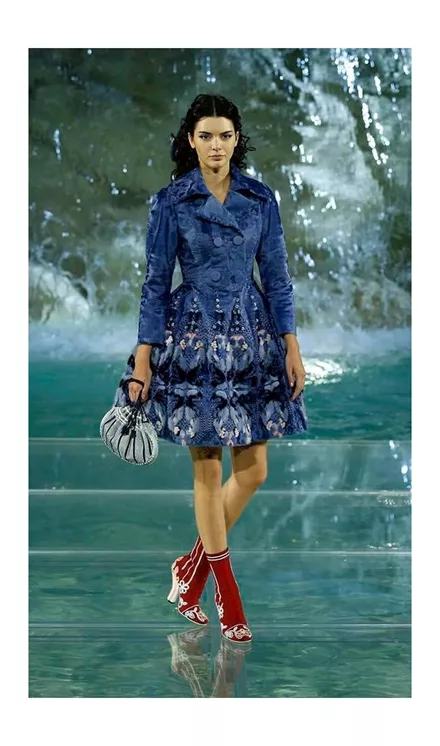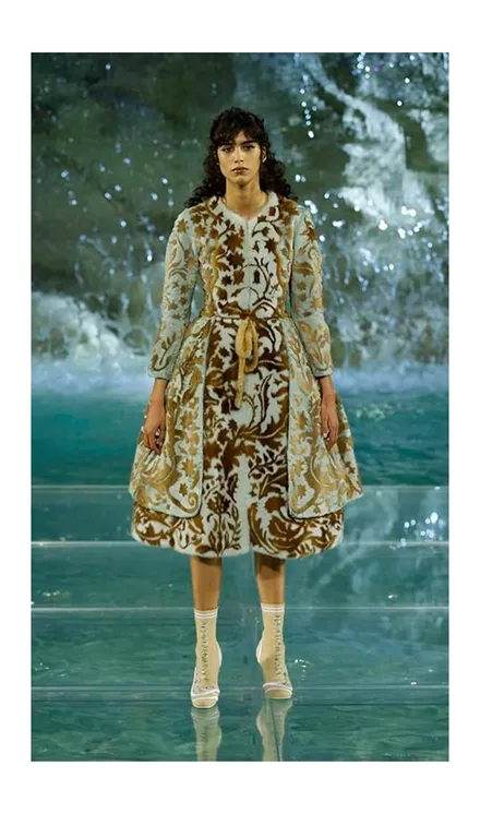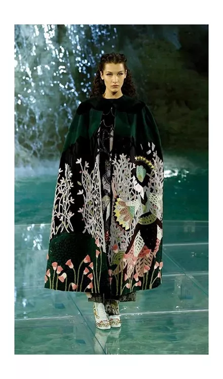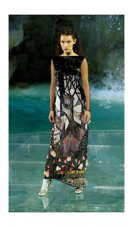 Τα περίτεχνα looks της συλλογής που συνδύαζαν περίτεχνα κεντήματα, έργα τέχνης, το στυλ των αναγεννησιακών ζωγράφων και, φυσικά, χρωματιστές γούνες παρουσιάστηκαν πάνω σε ένα γυάλινο catwalk που περικύκλωνε το εντυπωσιακό συντριβάνι.