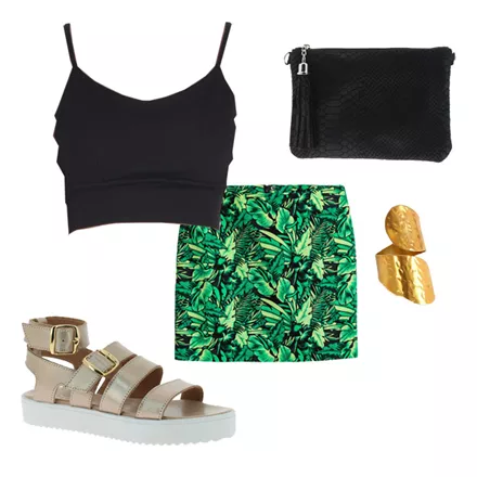 Φούστα, H&M, 19,99 ευρώ, hm.comΤοπ, Molly Bracken, από 47,00 ευρώ τώρα 33,00 ευρώ, sagiakos.grΔαχτυλίδι, e-xclusive, από 9 ευρώ τώρα 8 ευρώ, e-xclusive.comΠέδιλο, IQ, 34,90 ευρώ, iqshoes.grΤσαντάκι, IQ, 23,90 ευρώ, iqshoes.gr