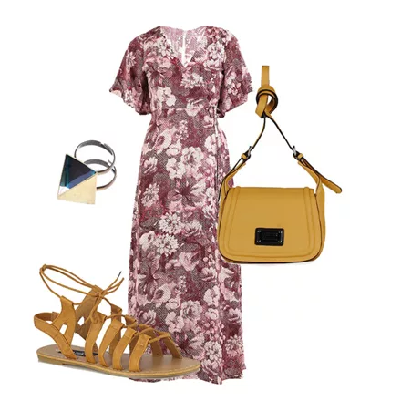 Floral φόρεμα, 79 ευρώ, www.e-xclusive.comΤσάντα, Fullah Sugah, 23 ευρώ, sagiakos.grΣανδάλια, BOZIKIS, 9.99 ευρώ, www.bozikis.grΔαχτυλίδι, 14.40 ευρώ, www.helmi.gr