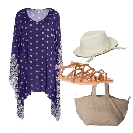 Φόρεμα Kimono εμπριμέ Helmi 58.90€, www.helmi.grΨάθινο καπέλο, BSB, από 19.90, τώρα 15.90 ευρώ, www.bsbfashion.comBeach bag Psatha Park House, Style Bubbles, 90.00 ευρώ, stylebubbles.comΔερμάτινα σανδάλια Sagiakos, από 69.00 ευρώ, τώρα 55.00 ευρώ, www.sagiakos.gr