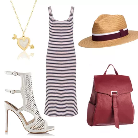 Φόρεμα ριγέ Pink Woman, 15,99 ευρώ, pinkwoman-fashion.comΛευκά πέδιλα Bozikis, 19,99 από 39,99 ευρώ, bozikis.grBackpack A.L.E., 47,90 από 59,90 ευρώ, attrattivo.grΨάθινο καπέλο H&M, 12,99 ευρώ, hm.comΚολιέ από κίτρινο χρυσό 9Κ με φίλντισι, Li- LA- LO, lilalo.com