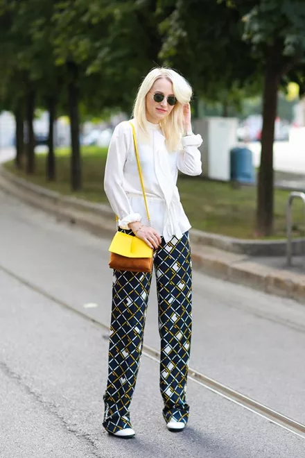 Τα graphic prints μετακομίζουν και στο παντελόνι σου και θυμίζουν 70s. Συνδύασε το με μονόχρωμη μπλούζα και αξεσουάρ για ισορροπημένο αποτέλεσμα.