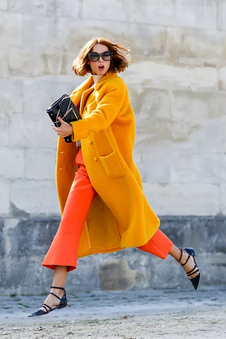 Και ναι, μην φοβηθείς το χρώμα! Όχι πια! Όχι φέτος! Πορτοκαλί παντελόνι (και μουσταρδί παλτό) σε μια εμφάνιση που κλέβει τις εντυπώσεις!
