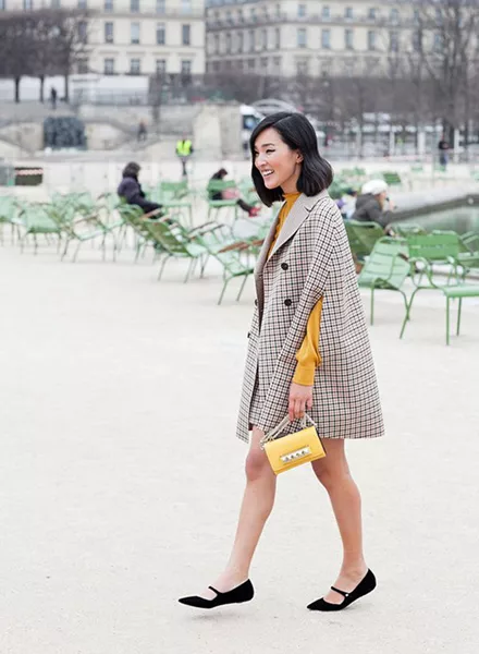 Μία κομψή κάπα και οι πιο σκούρες αποχρώσεις του κίτρινου συνθέτουν ένα νοσταλγικό αλλά και παιχνιδιάρικο χειμερινό σύνολο