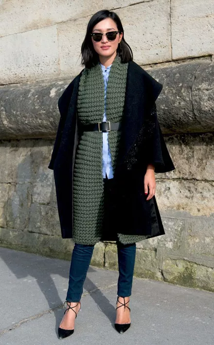 Όπως και το καλοκαίρι, έτσι και τώρα, το φαρδύ κασκόλ φορεμένο με ζώνη στη μέση όχι μόνο είναι trendy αλλά κολακεύει και τη σιλουέτα σου