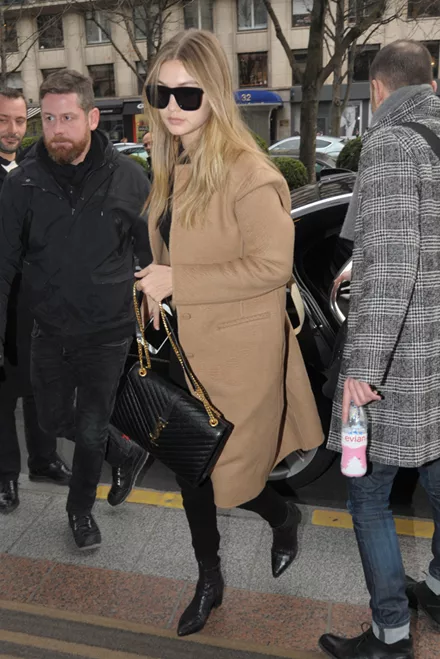 H Gigi στο Versace Show, φορώντας μαύρο κολάν του οίκου