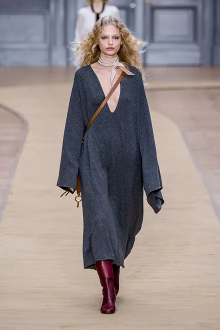 Tα πλεκτά φορέματα γίνονται οι go-to επιλογές σου. Ένα μαντήλι δεμένο στον λαιμό είναι το πιο εύκολο accessorizing για instant-update. (Chloe)