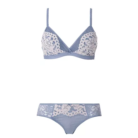 Λευκό συνδυασμένο με μπλε, όπου ανάγλυφα floral σχέδια αναμειγνύονται με tone-on-tone δαντέλα και δημιουργούν ελαφριές παστέλ αποχρώσεις που αγκαλιάζουν απαλά τη τάση ντένιμ.
