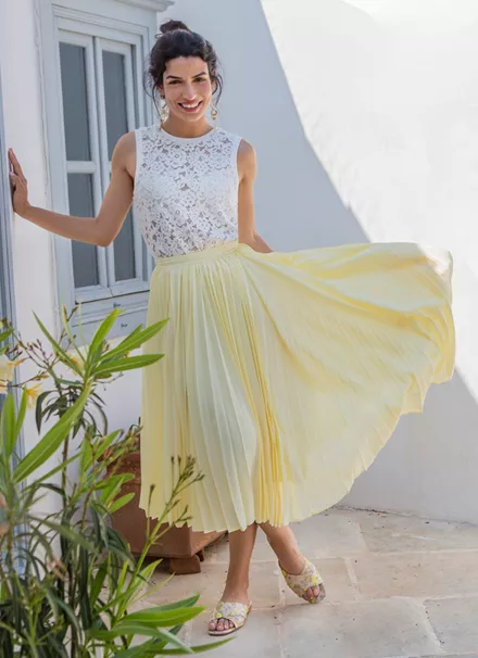 Λευκή δαντέλα και πλισέ φούστα - Τόνια ΣωτηροπούλουΜία πλισέ midi φούστα είναι πάντα μια καλή ιδέα για το καλοκαίρι. Θηλυκό, αλλά και girly ταυτόχρονα, αυτό το κομμάτι μπορεί να δώσει μια ρετρό διάθεση σε ένα κατά τ' άλλα ανέμελο, νησιώτικο look.Extra Tip: Συνδύασε τη συγκεκριμένη φούστα με χρυσά κοσμήματα και floral slides για απόλυτη χρωματική ισορροπία.