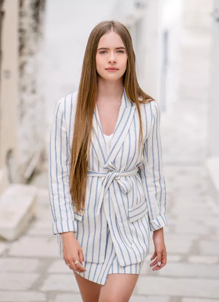 Stripes on Stripes - Αναστασία ΤσιλιμπίουΠοιος είπε ότι τα matching looks είναι εκτός μόδας; Ένα ριγέ σακάκι και ένα εξίσου ριγέ λινό σορτς είναι ακριβώς ότι χρειάζεται μια βαλίτσα διακοπών, πόσο μάλλον όταν έρχονται στον χρωματικό συνδυασμό λευκό – γαλάζιο. Ίσως η καλύτερη μετάβαση από το πρωί στο βράδυ και από την πόλη στο νησί γενικότερα.