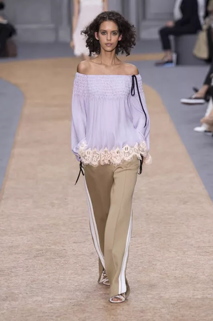 Aν ένα off-the-shoulder τοπ σε παστέλ απόχρωση σου φαίνεται πολύ ρομαντικό, εξισορρόπησε το με φαρδύ, ψηλόμεσο παντελόνι και πλατφόρμες. Μην ανησυχείς, στο δεύτερο ραντεβού θα φορέσεις μίνι φούστα! (Chloe)