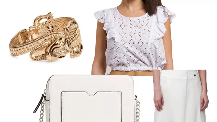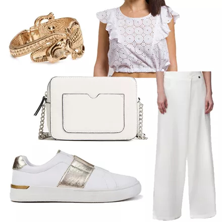 Παντελόνα ‘ALE, 39,90 ευρώ, ale.com.grCrop top με κέντημα Hype, 21,40 ευρώ, hype.grΤσαντάκι με αλυσίδα Mango, 12,99 ευρώ, mango.comΛευκά slip ons Migato, 15,00 ευρώ, migato.comΒραχιόλι H&M, 9,99 ευρώ, hm.com