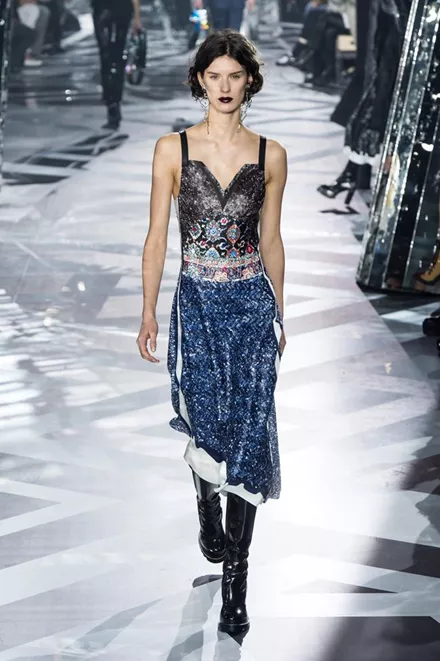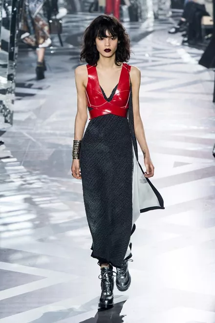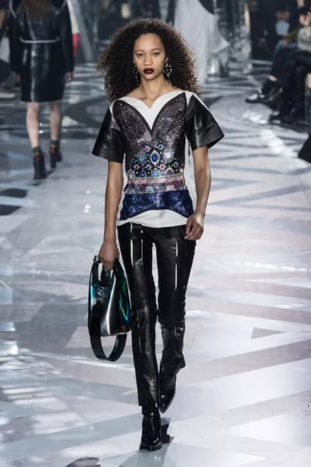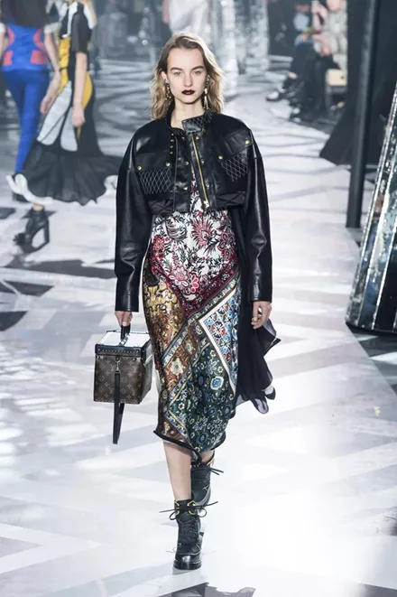 Ετοιμοπόλεμες και με μια δύναμη που πηγάζει από τη νοσταλγία ήταν οι γυναίκες του οίκου Louis Vuitton, που περπάτησαν σε ένα σκηνικό - έργο τέχνης διακοσμημένο με κομμάτια σπασμένου καθρέφτη και γεωμετρικά πλακάκια.Slip dresses από μεταξωτά φουλάρια και skinny παντελόνια συνδυάστηκαν με boxy δερμάτινα τζάκετ. Ολόσωμες φόρμες με biker αναφορές εμφανίστηκαν δίπλα δίπλα με αέρινα φορέματα και δερμάτινα bustier.