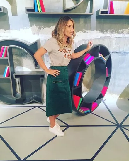 Στην πρεμιέρα της εκπομπής τους, η Μαρία Ηλιάκη επέλεξε να φορέσει ένα T-shirt Scotch & Soda, που συνδύασε με φούστα Golden Goose Deluxe Brand και sneakers Oysho.