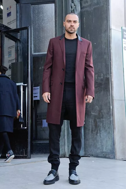 Ο ηθοποιός Jesse Williams εντυπωσιάζει με total black look και ένα βαθύ μπορντό πανωφόρι