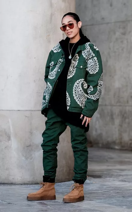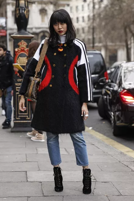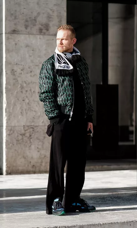Σου αρέσει το total black look; Σπάστο με ζωηρόχρωμα αθλητικά παπούτσια και ένα γεωμετρικό μοτίβο στο μπουφάν σου