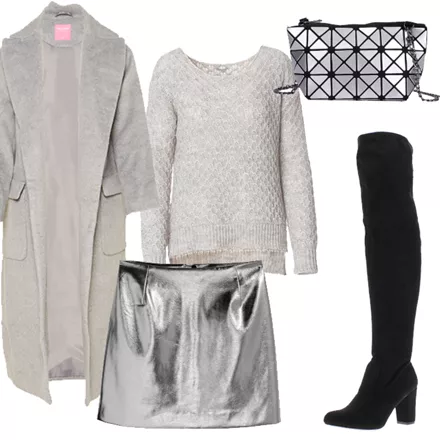 Μίνι φούστα μεταλλιζέ H&M, 24,99 ευρώ, hm.com/grΜπότα πάνω από το γόνατο IQ Shoes, 54,90 ευρώ, iqshoes.grΑσύμμετρο πουλόβερ Regalinas, 39,90 ευρώ, regalinas.grΠαλτό Pink Woman, 48,99 ευρώ, pinkwoman-fashion.comΤσάντα χειρός Gessy, 15,00 ευρώ, favela.gr