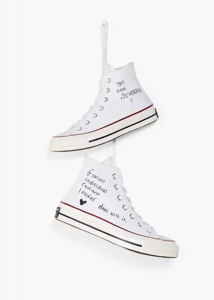 Η digital και outdoor καμπάνια μεταξύ άλλων περιέχει και τις ιστορίες πολλών γνωστών και σημαντικών γυναικών. Έτσι την «ερμηνεία» για το τι σημαίνει να είσαι κορίτσι μοιράζονται η ηθοποιός και ακτιβίστρια Millie Bobby Brown, η πρώτη μπαλαρίνα Ηijabi Stephanie Kurlow, η εκπαιδεύτρια αυτοάμυνας Qin Yungquan, η αντικομφορμίστρια μουσικός Naomi Preizler και τη tech expert Kasia Gola. Η κάθε μία διατύπωσε το δικό της ορισμό χειρόγραφα στον εμβληματικό καμβά ενός Chuck Taylor.