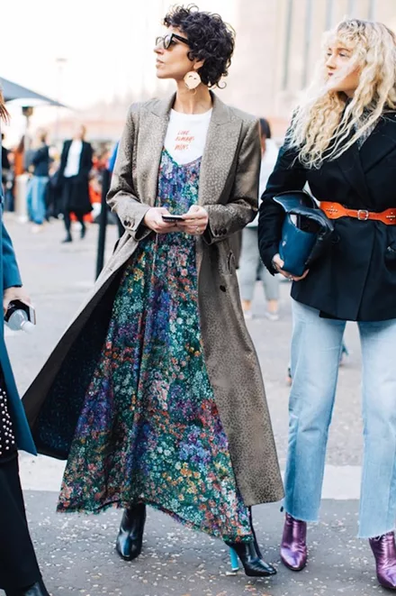 Φόρεσε ένα μάξι φλοράλ φόρεμα πάνω από ένα t-shirt, μαζί με την καμπαρντίνα σου.