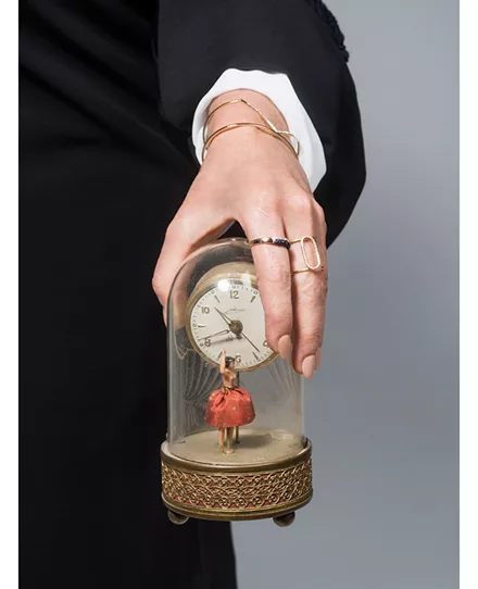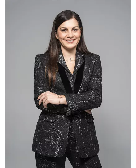 Η Μαριέττα Φαφούτη φοράει δαχτυλίδι από λευκόχρυσο Κ18 με μπριγιάν και μαύρο επιπλατίνωμα από την TRIANGLE COLLECTION, δαχτυλίδι από ροζ χρυσό Κ18 με μπριγιάν από την TRIANGLE COLLECTION και δύο μενταγιόν από ροζ χρυσό Κ18 από την ίδια συλλογή καθώς και βραχιόλι από λευκόχρυσο Κ18 με μπριγιάν και μαύρο επιπλατίνωμα από την LINEAR CHIC COLLECTION.