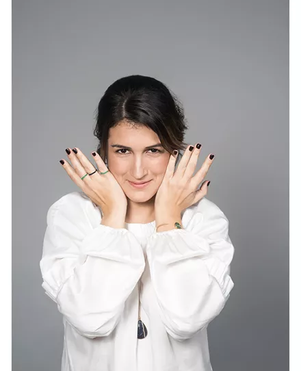 Η Τίνα Άστρα φοράει δαχτυλίδι από χρυσό Κ18 με μπριγιάν και σμαράγδια και δαχτυλίδι από ροζ χρυσό Κ18 με μπριγιάν και μπλε ζαφείρια και τα δύο από την DOT COLLECTION, καθώς και βραχιόλι από χρυσό Κ18 με μπριγιάν και σμαράγδι και μενταγιόν από ροζ χρυσό Κ18 με μπριγιάν και μπλε ζαφείρι από την NYMPHS COLLECTION.