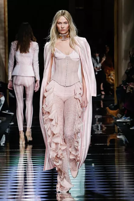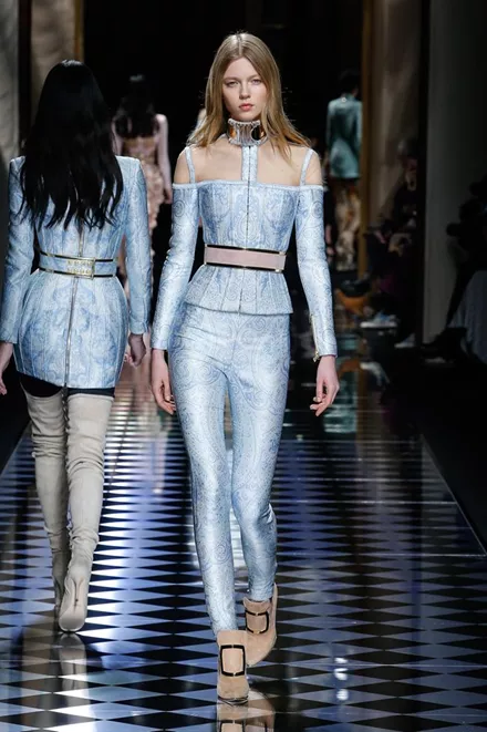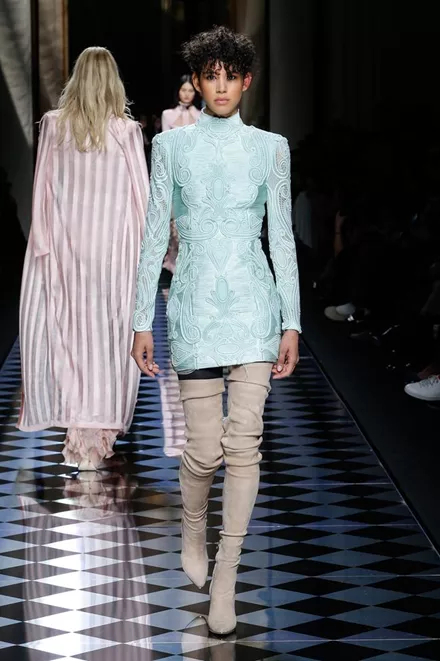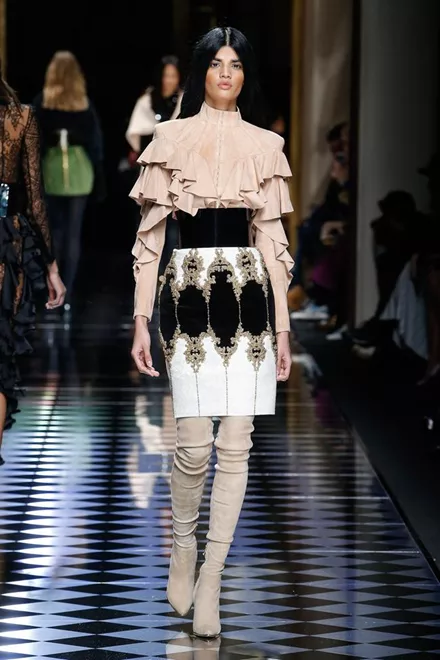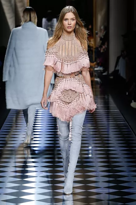 Ως σύγχρονη Μαρία Αντουανέτα θα μπορούσε κανείς να περιγράψει τη glamorous μούσα του οίκου. Με σκονισμένες παστέλ αποχρώσεις, κεντήματα, βολάν, κρόσσια και πολυτελείς μεταλλικές λεπτομέρειες, η νέα συλλογή δεν φεύγει μακριά από το στυλ που ο Olivier Rousteing έχει καθιερώσει για τον Balmain αν και μοιάζει να θέτει τις βάσεις για μια χειμερινή χρωματική παλέτα που θα θέλαμε πολύ να δούμε ως τάση.