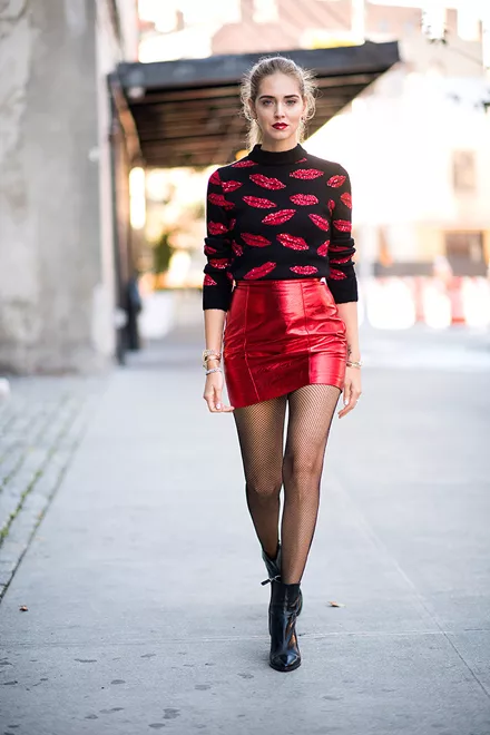Η Chiara Ferragni φοράει το διχτυωτό καλσόν μαζί με μεταλλιζέ φούστα και άνετο πουλόβερ για ένα ισορροπημένο αλλά και σέξι look.