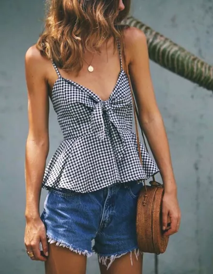Είτε πρόκειται για ένα beach look είτε για μια urban εμφάνιση, το απόλυτο καλοκαιρινό ντύσιμο συνδυάζει ένα top με καρό gingham μοτίβο, denim (shorts ή παντελόνι) και ένα ψάθινο καλάθι που παραπέμπει στη Jane Birkin.