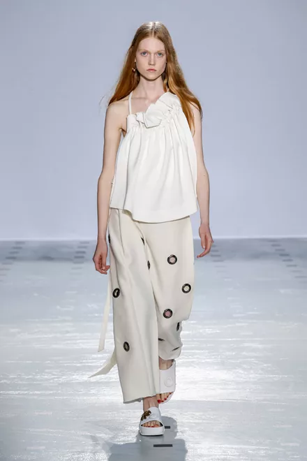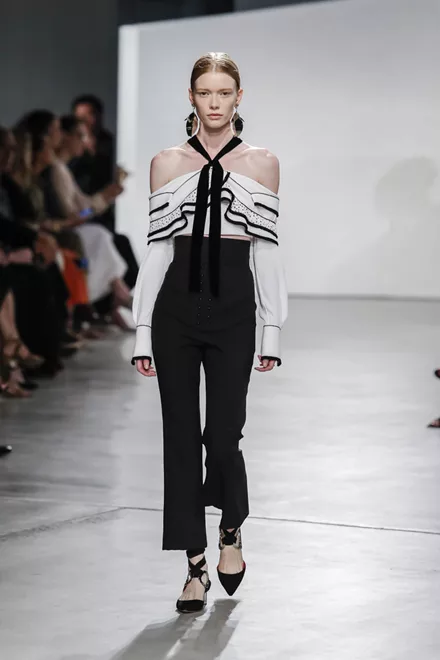 Δεν είναι τόσο το ασπρόμαυρο σύνολο, όσο οι λεπτομέρειες που ξεχωρίζουν: οι εκτεθειμένοι ώμοι, τα lace-up παπούτσια, τα statement κοσμήματα αλλά και το sleek hairstyle είναι «σημεία» που δεν μπορούν να λείπουν από ultra chic εμφανίσεις. (Proenza Schouler)