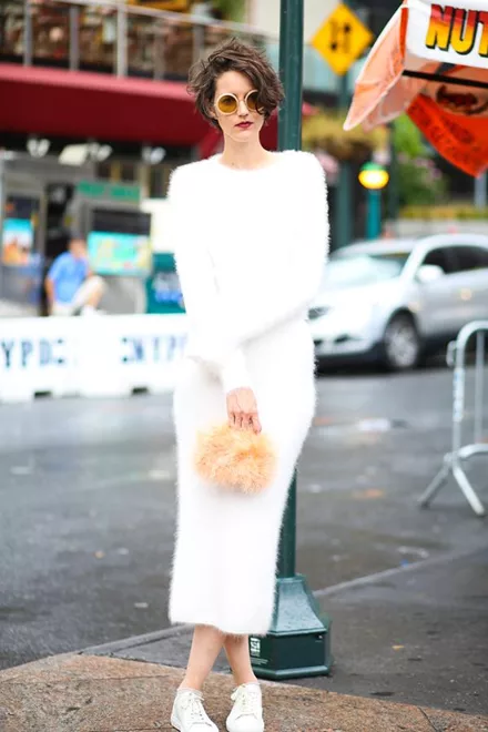 Το λευκό και ιδανικό χρώμα και για τη νέα σεζόν, ιδίως όταν το συναντάς σε μάξι χνουδωτό φόρεμα και, φυσικά, sneakers.