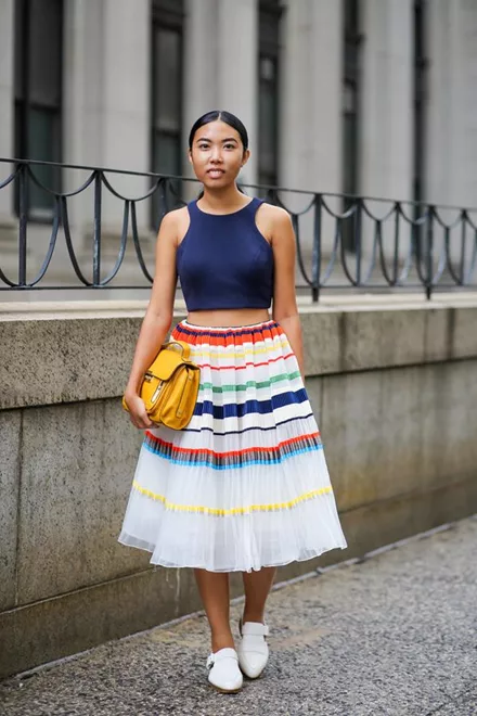 Tο crop top φοριέται και το φθινόπωρο με μια mid full φούστα. Εδώ η φούστα δίνει ακόμα και τον χρωματικό τόνο σε ολόκληρο το outfit.