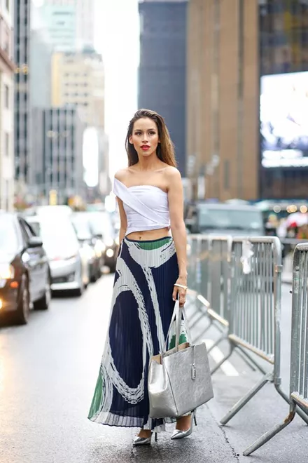 Η maxi φούστα με το graphic print συνδυάζεται με ασημένια αξεσουάρ για ένα ενδιαφέρον οπτικό αποτέλεσμα.