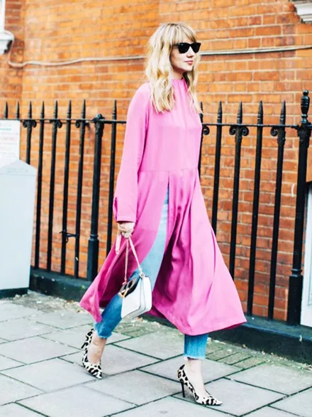 Ένα φούξια φόρεμα δε χρειάζεται να φορεθεί μόνο του. Συνδύασέ το με το αγαπημένο σου τζιν παντελόνι για ένα cool outfit.