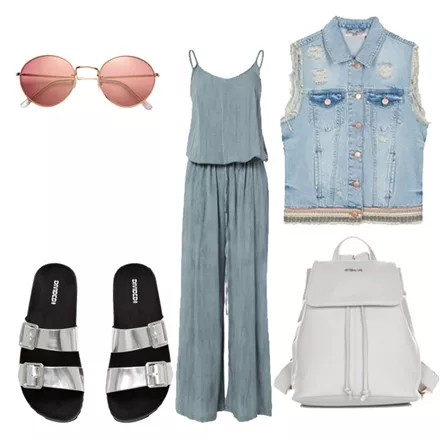 Ολόσωμη φόρμα, Helmi, 69,90 ευρώ, helmi.grΓιλέκο, BSB, 79,90 ευρώ, bsbfashion.comΓυαλιά, H&M, 7,99 ευρώ, hm.comΣανδάλια, H&M, 19,99 ευρώ, hm.comΣακίδιο, Axel, 69,00 ευρώ, axelaccessories.com