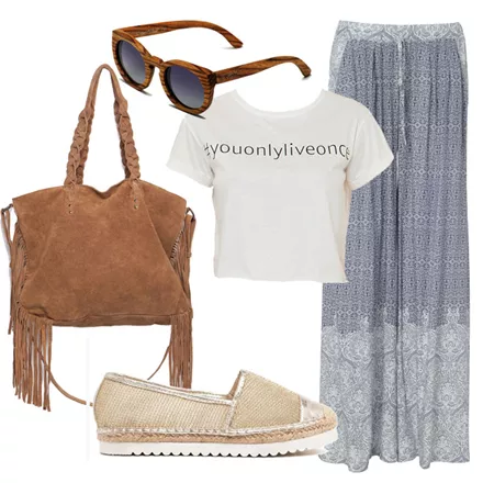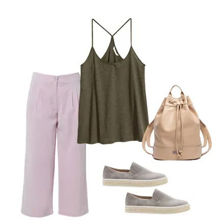 Παντελόνα, HELMI, 59.90 ευρώ, www.helmi.grΜπλουζάκι, Pink Woman, 9 ευρώ, www.pinkwoman-fashion.comEspadrilles, Migato, 45 ευρώ, www.migato.comΤσάντα, BSB, 89.90 ευρώ, www.bsbfashion.comΞύλινα γυαλιά ηλίου, 140 ευρώ, www.jamjar.gr
