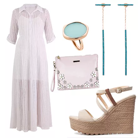 Μάξι φόρεμα δαντελέ e-xclusive 89,00 ευρώ, e-xclusive.comΜπεζ σουέντ πλατφόρμα 57,00 ευρώ, migato.comΣκουλαρίκια από επιχρυσωμένο ασήμι 925 και πλακίδια τυρκουάζ, 60,00 ευρώ, lilalo.comΔαχτυλίδι επιχρυσωμένο με τυρκουάζ, 65,00 ευρώ, lilalo.comΤσαντάκι LYDC, 20,00 ευρώ, favela.gr