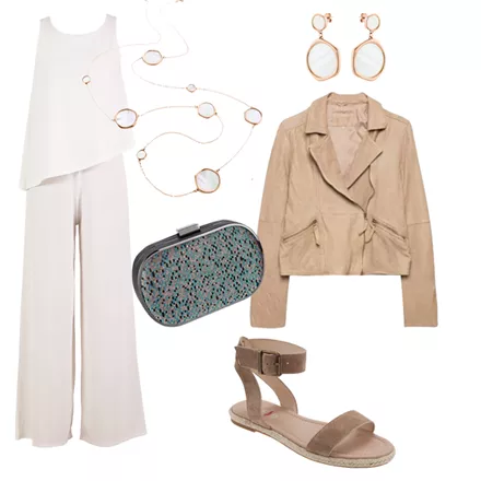 Λευκή κρεπ ολόσωμη φόρμα e-xclusive, 79.00 ευρώ, www.e-xclusive.comΚοντό δερμάτινο τζακετ BSB, 239.90 ευρώ, www.bsbfashion.comFlat σανδάλι Keep Fred, 59.00 ευρώ, www.keepfred.grClutch με αλυσίδα Achilleas Accessories, από 33.90 ευρώ, τώρα 27.12 ευρώ, achilleasaccessories.grΣκουλαρίκια Aura Collection Li-La-Lo, 90.00 ευρώ, www.lilalo.comΚολιέ Aura Collection, Li-La-Lo, 130.00 ευρώ, www.lilalo.com