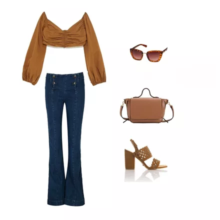 Τοπ με φουσκωτά μανίκια 39.95 ευρώ, zara.comΤζιν παντελόνι σε γραμμή καμπάνα 49.95 ευρώ, bsbfashion.comΠέδιλα με διάτρητο σχέδιο 37.50 ευρώ, axelaccessories.comΤσάντα 26.95 ευρώ, carpisa.itΓυαλιά ηλίου Minkpink 45.00 ευρώ, favela.gr