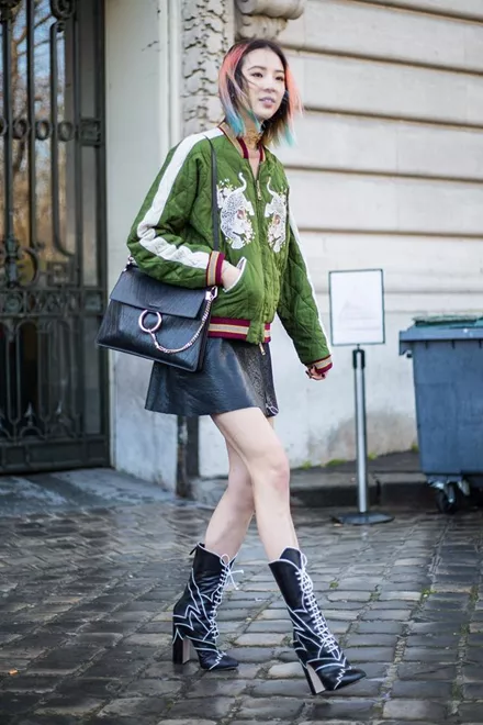 Όσο πιο μικρή είσαι τόσο μεγαλύτερη "ελευθερία" έχεις στο να παίξεις με μοτίβα, στυλ, υλικά, μήκη και χρώματα και όλα στο ίδιο outfit. Εδώ η Irene το κάνει σωστά με δερμάτινη μίνι φούστα και statement bomber jacket.